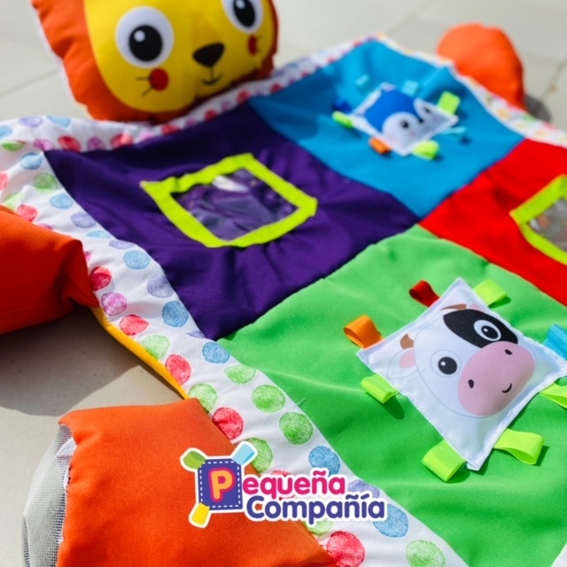 Alfombra didactica leon acolchada con actividades en la base, bolsillo de pvc para foto figuras de alto contraste, metalizado y patas con metalizado texturado. Consultar stock, por pedido, demora 15 dias.