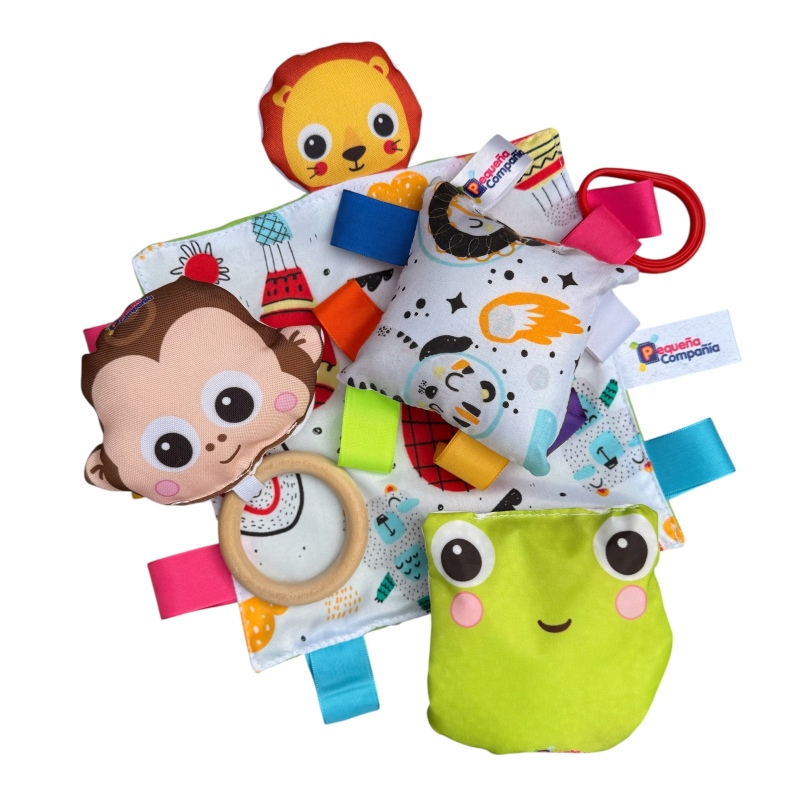 Incluye: trapito de apego, sonajero cuadrado o triangulo, mordillo selva y animalito para el agua.