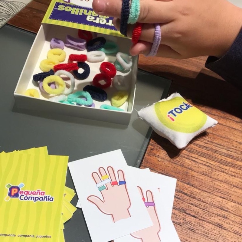 Incluye un maso de cartas, una bolsa con anillos elasticos de colores y una almohadilla sonora.