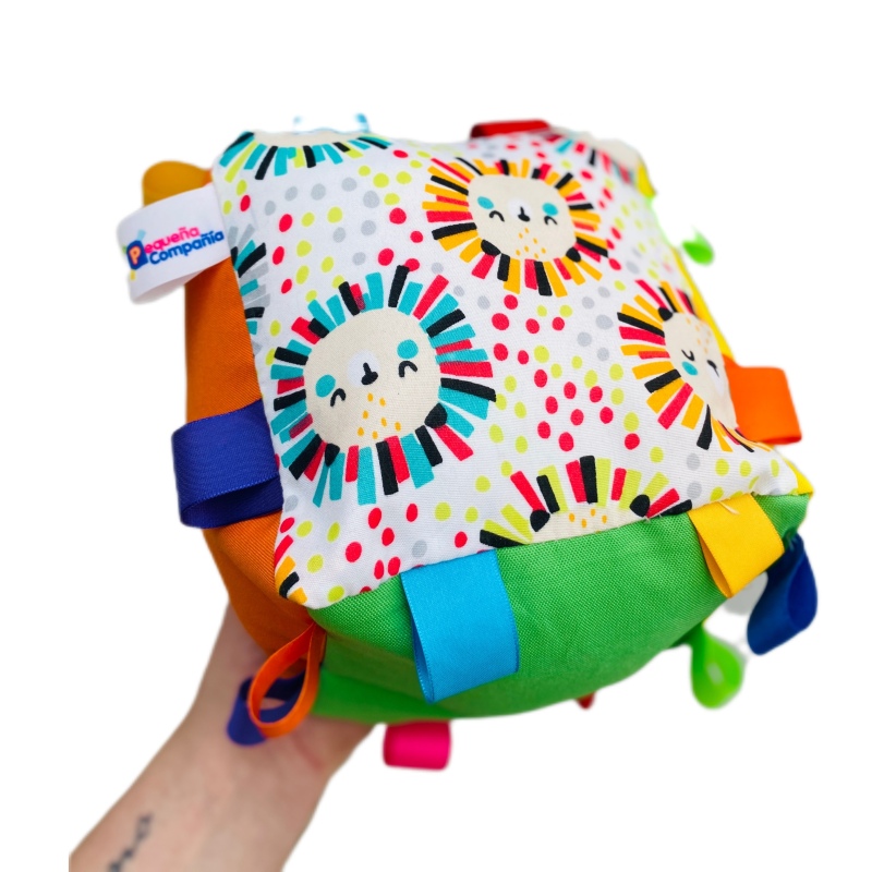 Cubo didactico blando con colores, texturas, cintas y sonido cascabel. Colores surtidos.