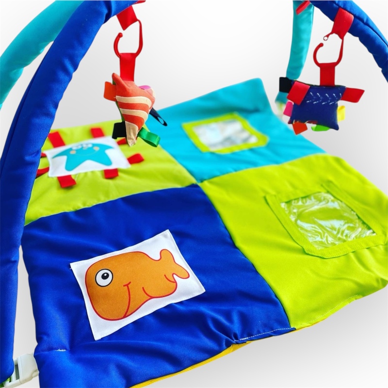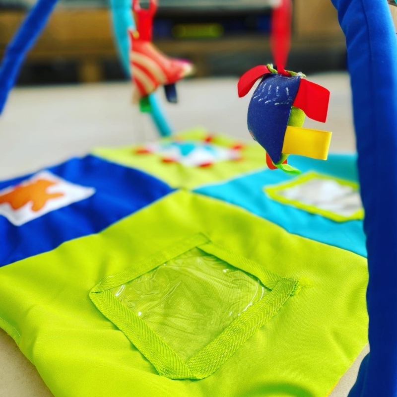 Gimnasio didactico con actividades en la base acolchada. Metalizado con textura, bolsillo transparente para foto y estampados. Incluye 2 sonajeros y bolso para su guardado. Edad recomendada de 0 a 6 meses. Colores surtidos. Demora 15 dias aproximadamente.