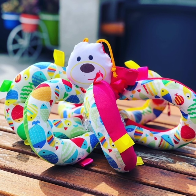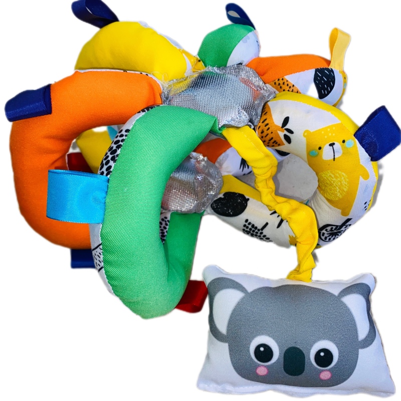 Pelota manijas con gajos rodeado de cintas, con sonido cascabel y carita con elastico. Colores surtidos.