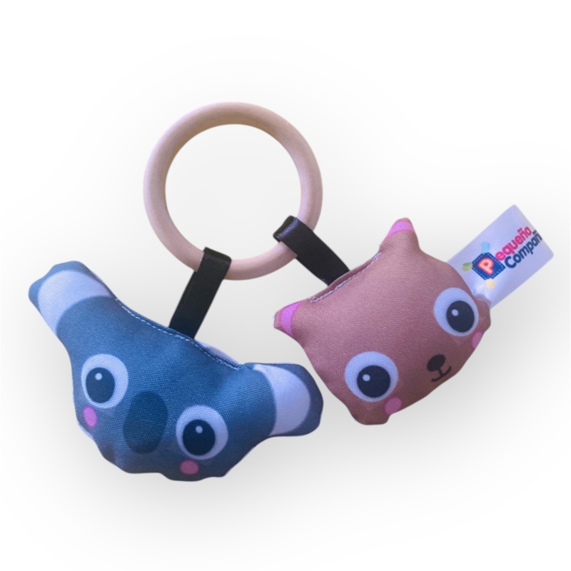 Sonajero y mordillo 2 en 1. Argolla de madera y animalitos blandos con sonido.