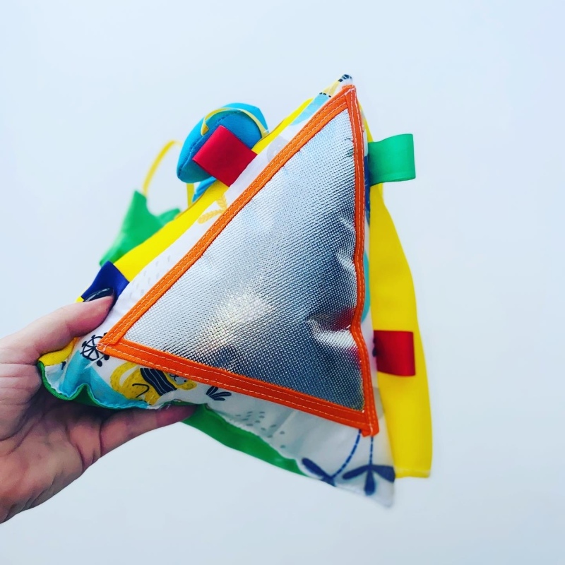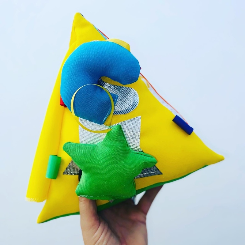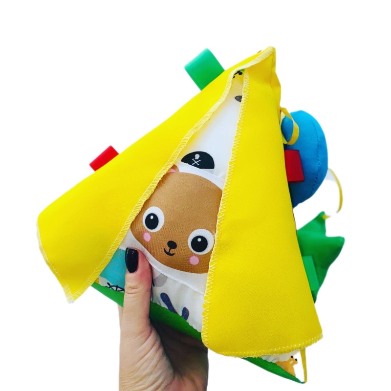 Juego didactico con forma de piramide. Incluye una actividad en cada una de sus caras: metalizado con textuta, formitas para pegar y despegar y puertitas para descubrir. Colores surtidos.