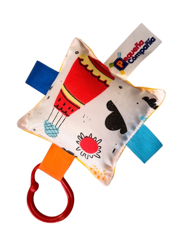 Sonajero pequeño cuadrado rodeado con cintas, sonido cascabel y gancho de plastico para sujetar. ideal para los mas chiquitos. Colores surtidos.